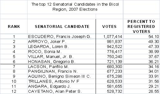 The statement of support for Escudero is clearly shown in the result of the 2007 Senatorial Elections where he ranked first garnering 54% of the total votes cast. Aquino, meanwhile, ranked 9th with only 34% of the total votes cast. In-between is Manny Villar, another presidential contender for the 2010 elections, ranking 5th and garnering 38%.
