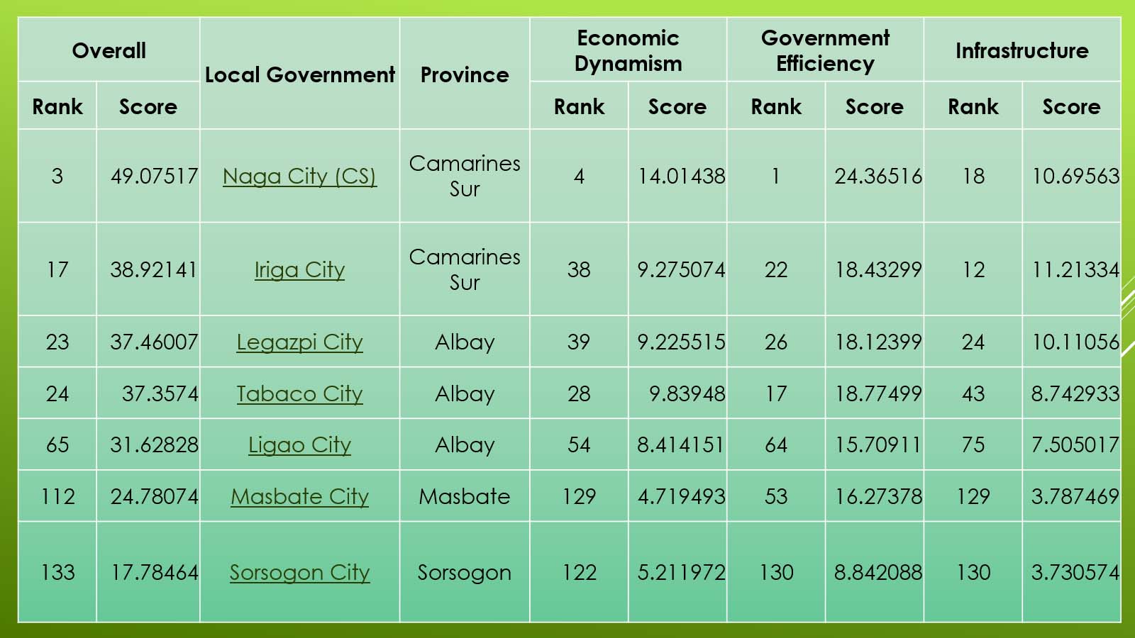 Base sa ranking, ika 3 an Naga City sa bilog na nasyon na may total na score na 49.08. Numero 1 an Naga sa government efficiency asin ika-4 ini sa economic dynamism. Ika-17 an Iriga City na may score na 38.92 samantalang an ika-23 an Legazpi na may score na 37.46.