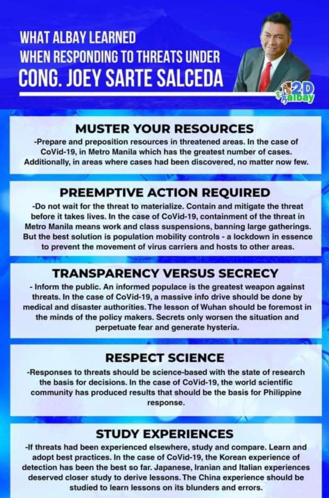 Former governor and Congressman Joey Salceda shares the lessons that Albay learned in mitigating the negative effects of disasters and how these can be used in responding to COVID-19. These are as follows: