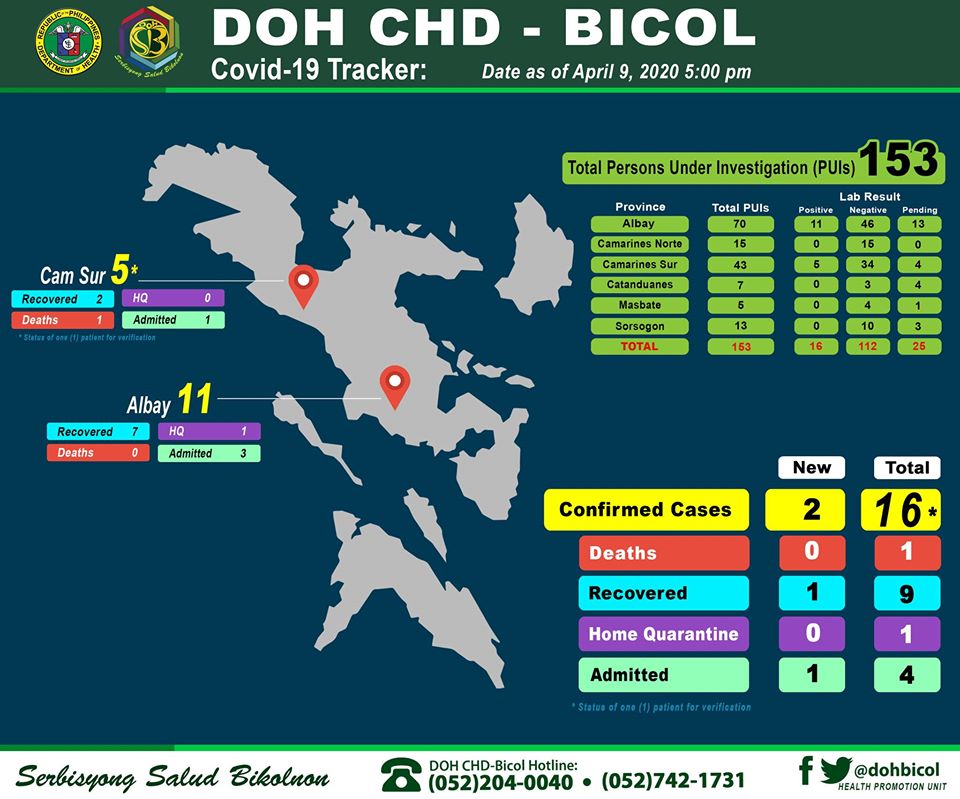 The Department of Health Center for Health Development Bicol (DOH-CHD Bicol) recorded two new cases of confirmed case of COVID-19 as of 9 April 2020 leading to a total of 16 cases in the region. One new recovery was also noted leading to a total of 9 recoveries.