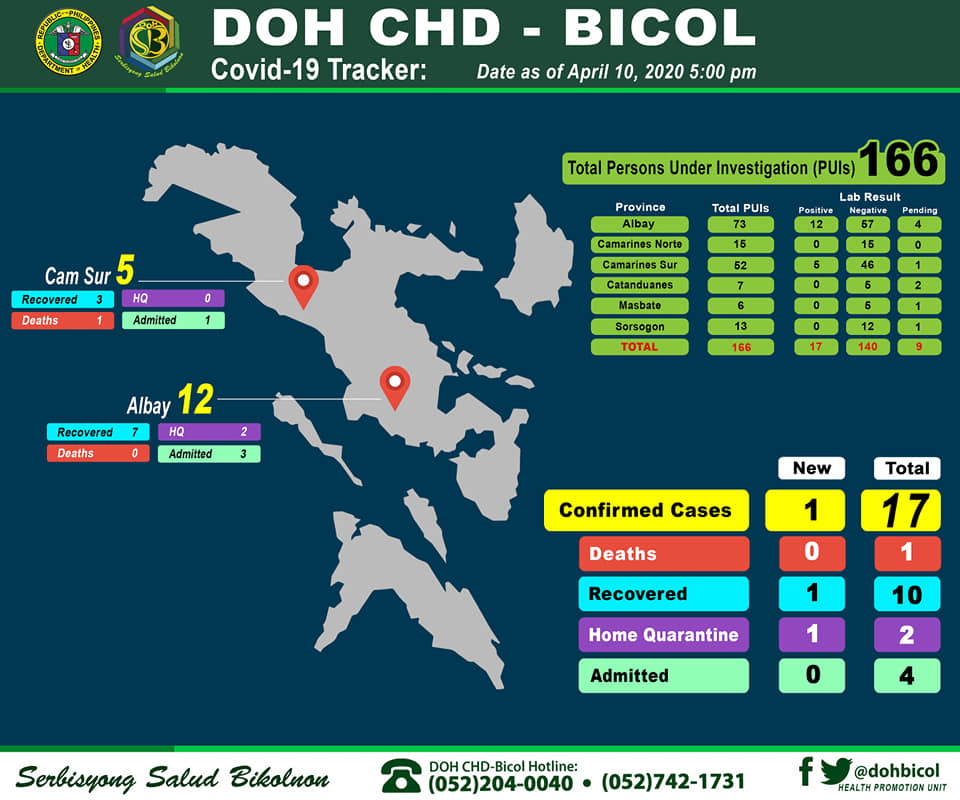 Bicol Region’s total number of confirmed cases of COVID-19 as of 10 April 2020 is now at seventeen (17), after one (1) new case was recorded today by the Department of Health Center for Health Development – Bicol (DOH .
