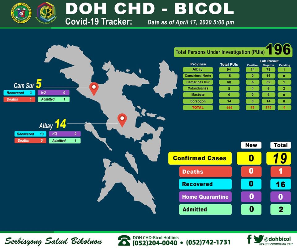 Bicol Region’s confirmed cases ,as of April 17, 2020 (5PM), remain at nineteen (19) according to the Department of Health Center for Health Development in Bicol (DOH CHD-Bicol). No new positive cases are recorded.