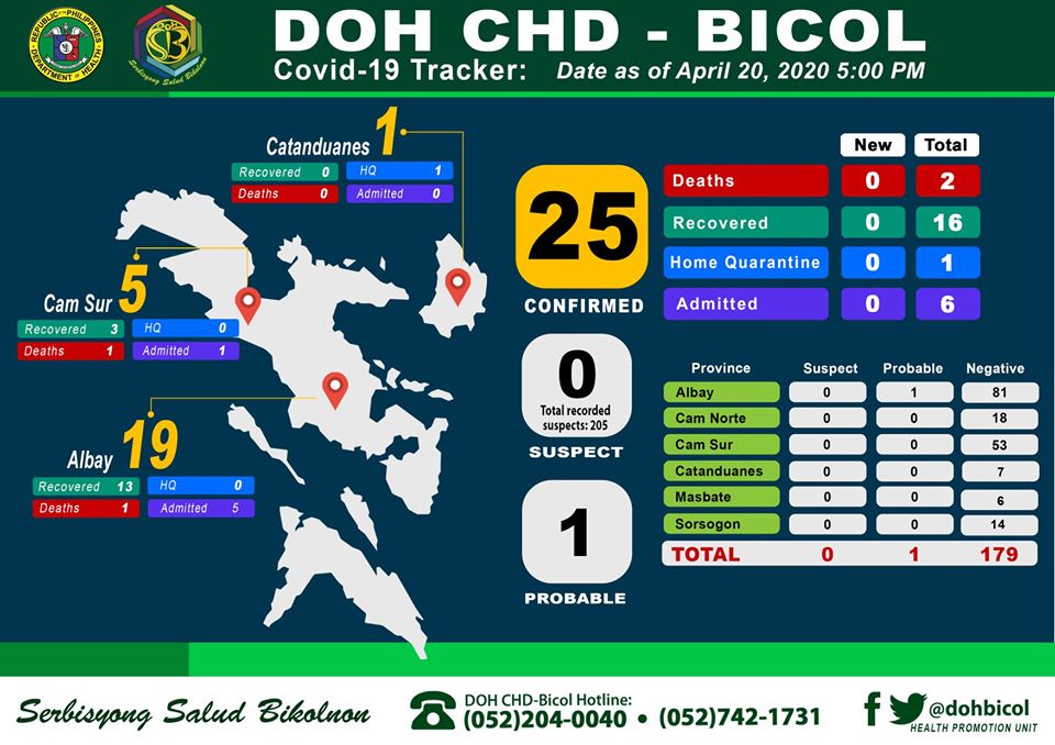 As of April 20, 2020 (5PM), the Department of Health Center for Health Development- Bicol (DOH CHD – Bicol) reported a total number of 25 confirmed Coronavirus disease (Covid-19) cases in the region with 16 recoveries, and 2 deaths.