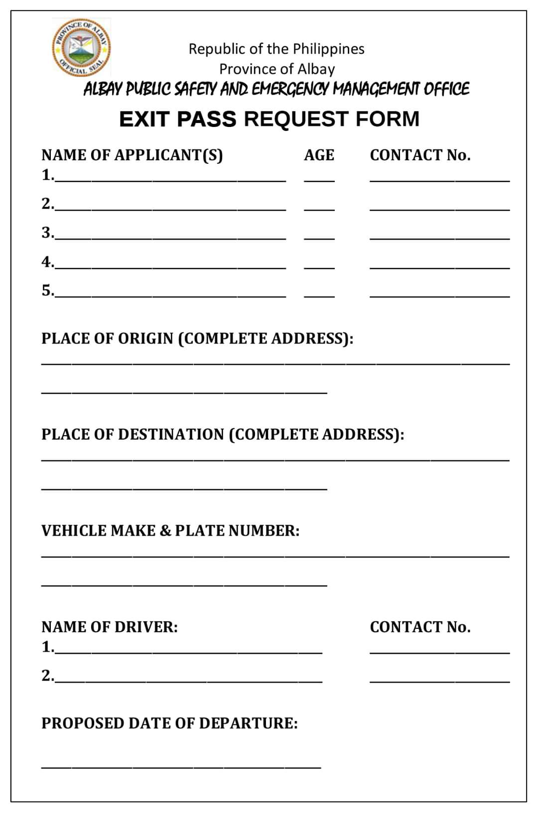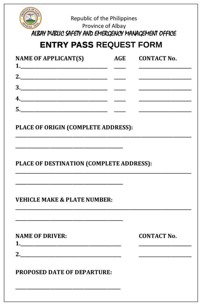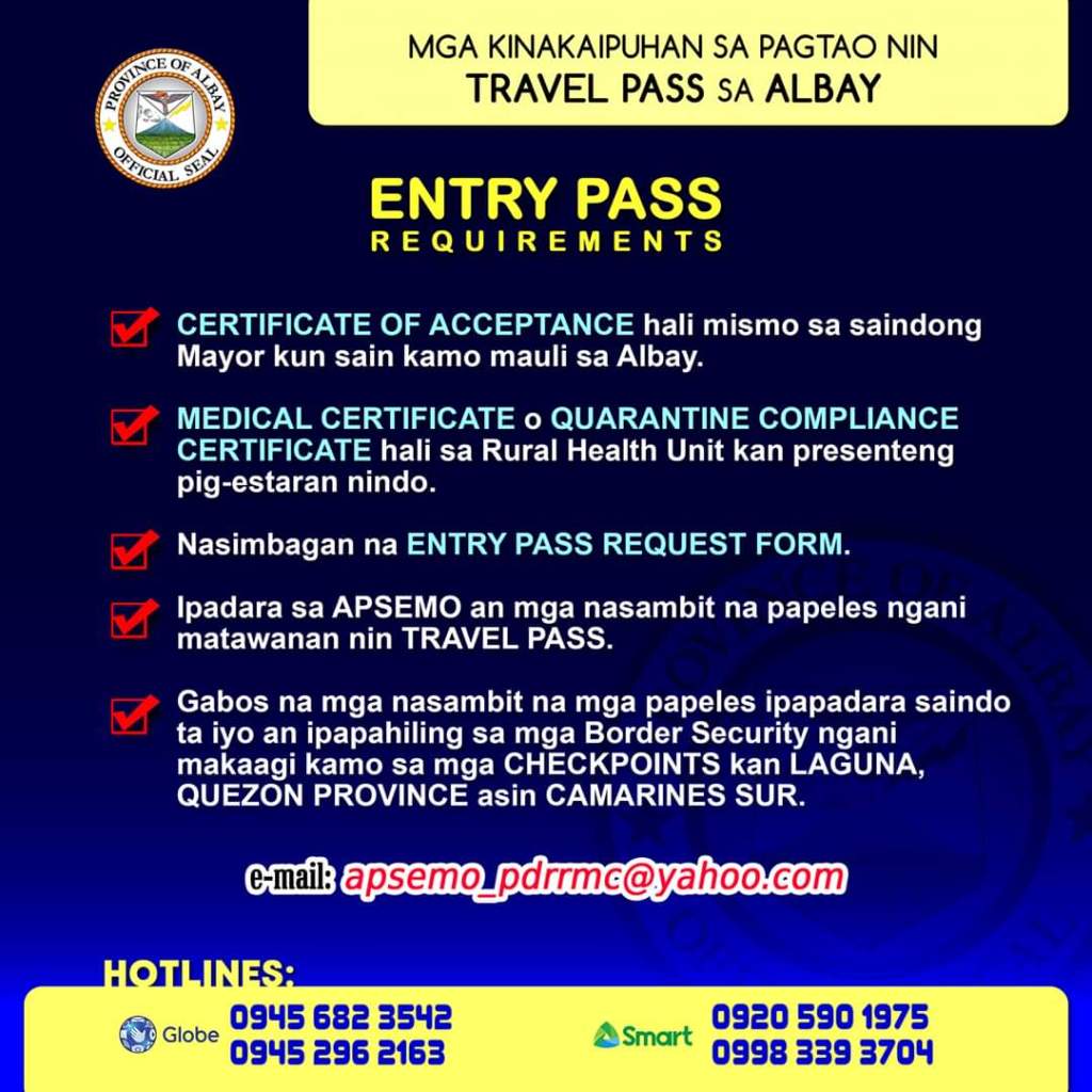 An mga requirements man sa mga maluwas sa Albay kaipuhan an exit pass. Uya an mga requirements para makakua ki exit pass: