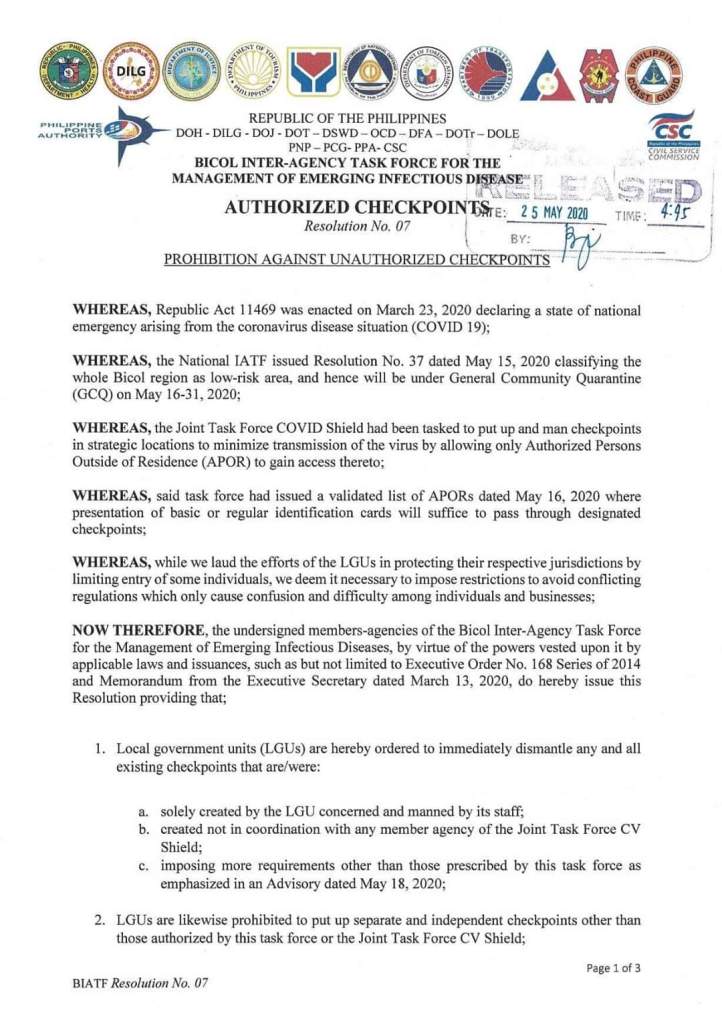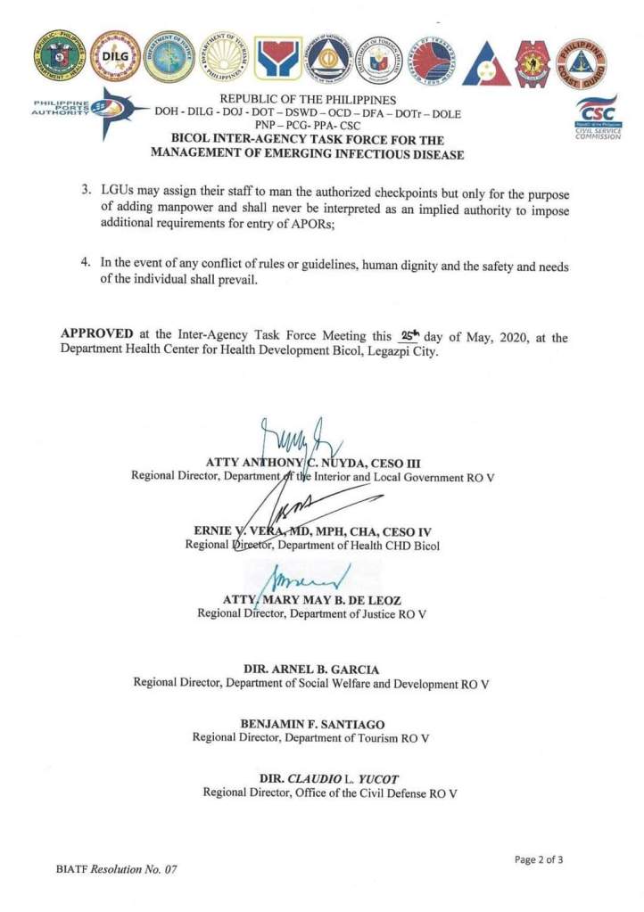 Based on the Bicol Inter-Agency Task Force (IATF) Resolution No. 07 dated