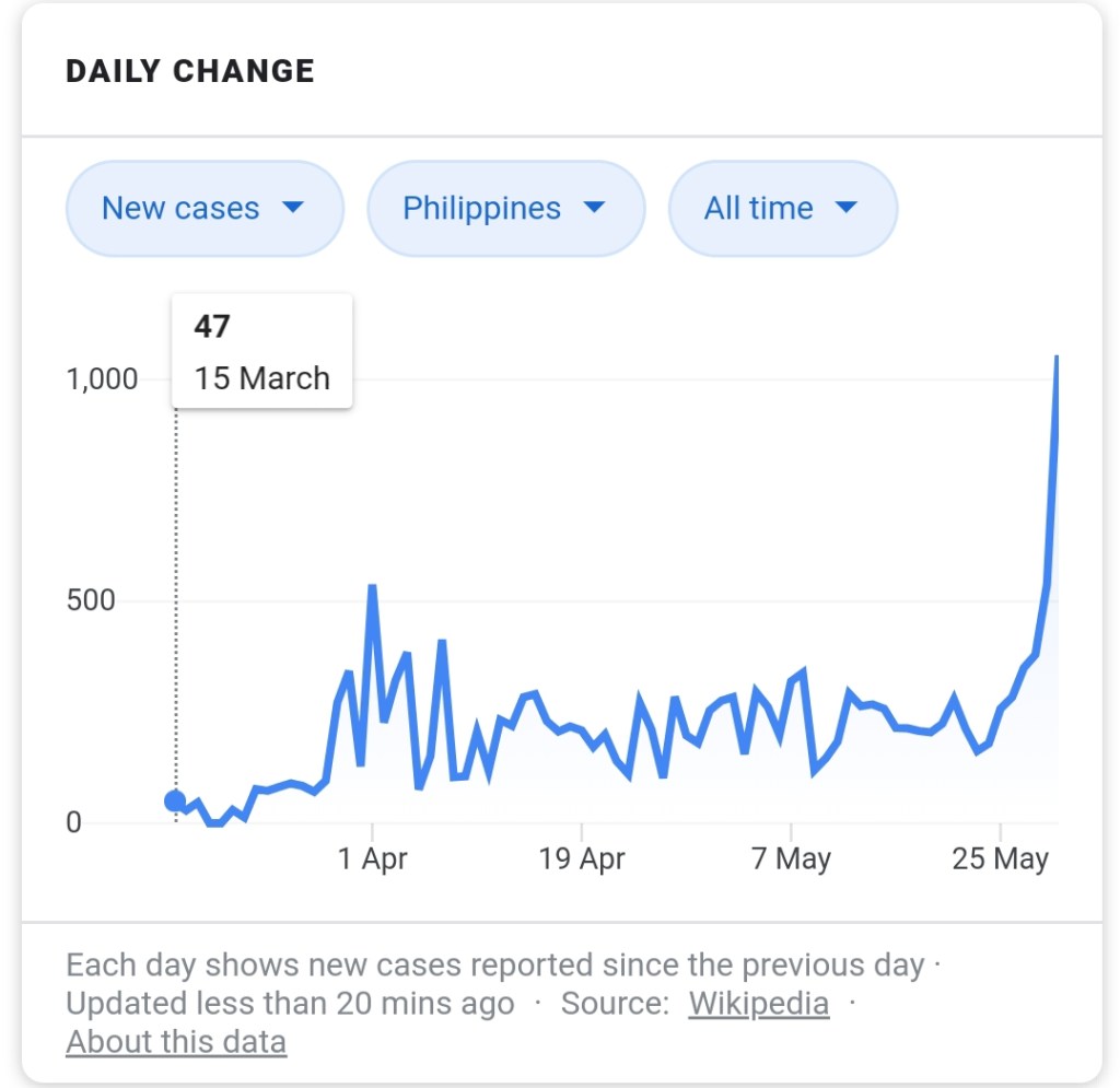 Total casea nationwide is 17,224 baaed on the May 30 data of the Department of Health. The figure shows a spike of 1,046 cases two days before the lifting of the enhanced community quarantine in Metro Manila. Death is recorded at 950.