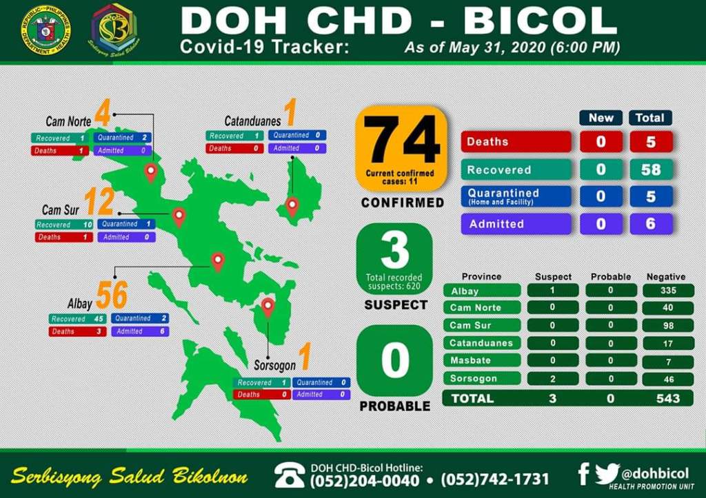 As of May 31, 2020, confirmed cases of COVID-19 recorded in Bicol Region 74.