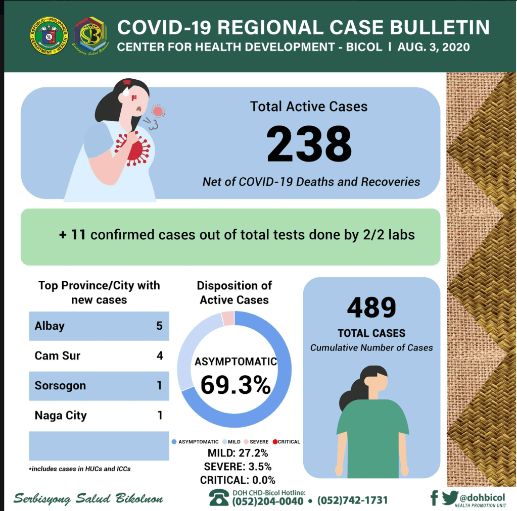 The Department of Health Center for Health Development (DOH CHD) – Bicol received 210 Covid-19 test results on Monday, August 3. Eleven of the results are positive of Coronavirus disease-19 bringing to 489 the total number of cases in Region 5.