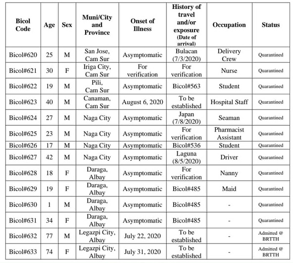 Of the 36 new cases, 10 are from Camarines Sur (5 Sipocot, 1 Buhi, 1 San Jose, 1 Canaman, 1 Iriga City, 1 Pili), 9 from Masbate (4 Baleno, 2 Masbate City, 2 Aroroy, 1 Dimasalang), 8 from Albay (4 Legazpi City, 4 Daraga), 4 from Catanduanes (3 Virac, 1 Baras),4 from Naga City, and 1 from Sorsogon (Pilar).