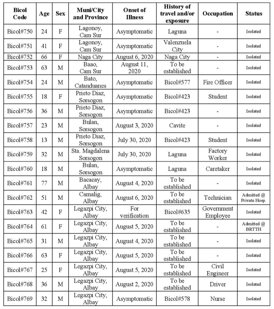 Of the 31 new cases, 20 are from Albay (8 Legazpi City, 1 Bacacay, 1 Camalig, 6 Daraga, 1 Ligao City, 2 Tabaco City, 1 Polangui), 6 from Sorsogon (3 Prieto Diaz, 2 Bulan, 1 Sta. Magdalena), 3 Camarines Sur (2 Lagonoy, 1 Baao), 1 Naga City, and o1 Catanduanes (Bato).The 31 new cases are tagged as patients with local code Bicol#750 to Bicol#780 with details below arranged per Municipality/City/Province.