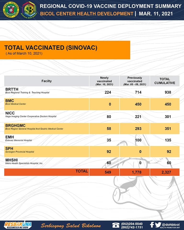 As of March 10, 2021, total of 2,327 medical healthworkers have been vaccinated with Coronavac. 938 of these are from the Bicol Regional Teaching and Training Hospital, 450 from Bicol Medical Center, and 351 from the Bicol Region General Hospital and Geriatric Medical Center. The rest of the vaccinated frontliners are from the Naga Imaging Center Cooperative Doctors’ Hospital, Estevez Memorial Hospital, Sorsogon Provincial Hospital and Metro Health Specialists Hospital, Inc.