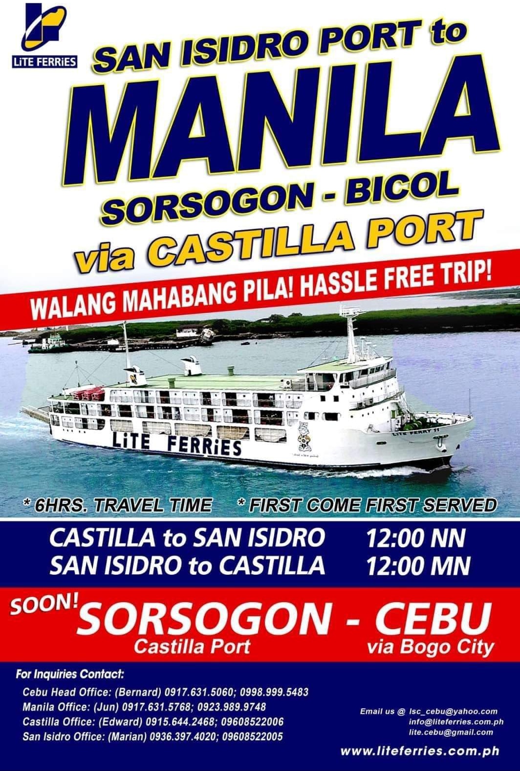 Lite Ferries, operated by Lite Shipping Corporation, will be sailing from Castilla, Sorsogon to Manila and other ports of call in Visayas and vice versa according to the information shared by Punong Barangay Alex Sotto of Poblacion Castilla Sorsogon. The maiden voyage of cargo and passenger vessels from Castilla Port will happen before the end of March 2021.