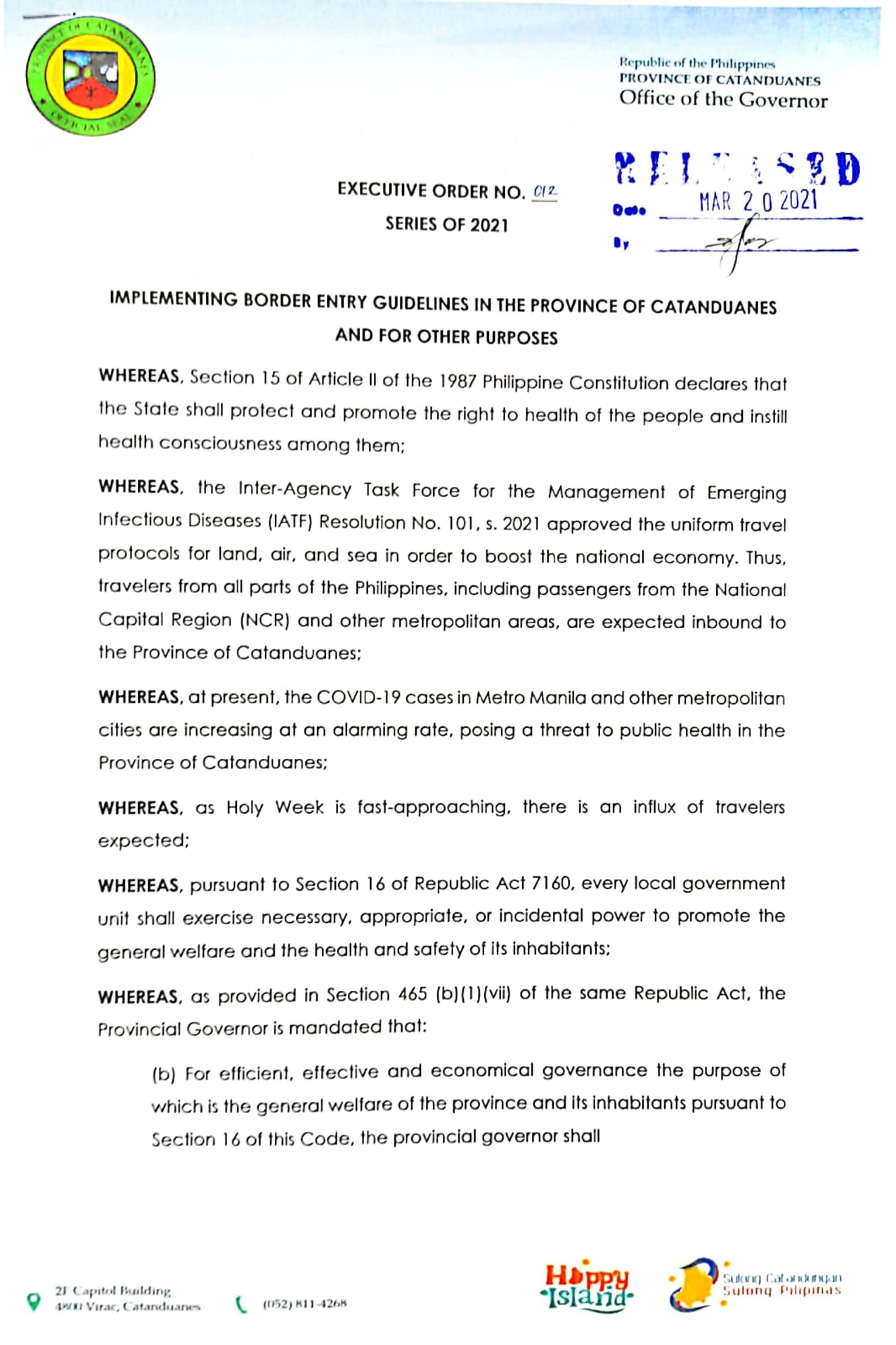 Catanduanes Governor Joseph Cua issued today, March 20, 2021, Executive Order No. 12 series of 2021 which defines the new border entry guidelines to the island province. The order is to take effect on Monday, March 22, 2021.