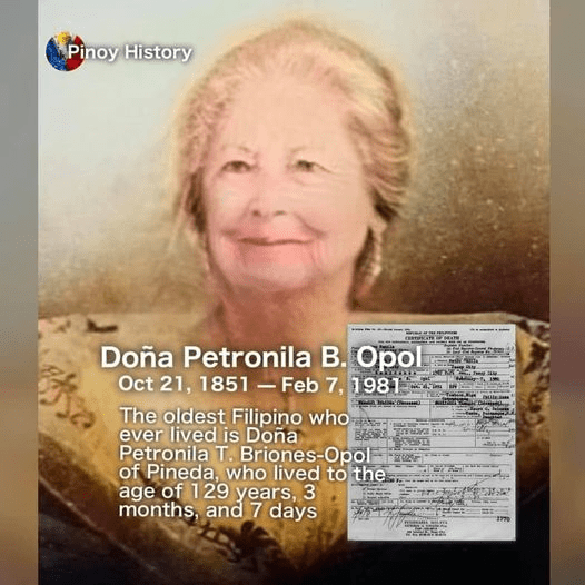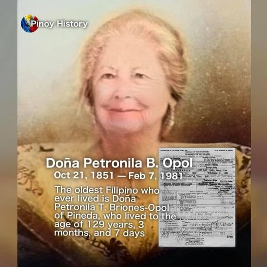She is from Tamboon, Viga, Catanduanes and was born on 21 October 1851. Yes, she experienced the last few decades of Spanish rule on to the American and Japanese periods, and the Marcos Regime. Her name is Doña Petronila T. Briones-Opol who lived to the age of 129 years, 3 months, and 7 days. She died on 7 February 1981.