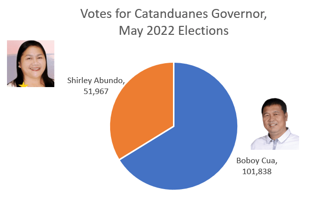 Joseph “Boboy” Cua and Peter “Boss Te” Cua both received the mandates of the Catandungans for governor and vice governor, respectively. Boboy was given another term while Boss Te had a fresh mandate.