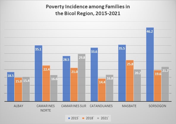 Compared to other provinces in Bicol, Camarines Sur is also the poorest performer in addressing poverty. In 2015, the poorest province is Sorsogon with 46.2% poverty incidence. This, however, was reduced by more than half to 21.7% in 2021. The same with Camarines Norte and Catanduanes. Even Masbate that is included in the poorest 20 provinces in the country along with Sorsogon, was able to reduce the poverty incidence by 15 points. In fact, of all the provinces, Masbate has been performing well that it looks like it wasn’t affected by the showed COVID-19 pandemic.