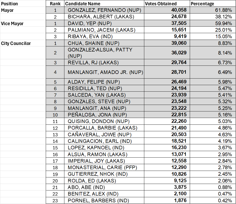 Yep David also took the Vice Mayoralty seat with 59.94% over Jacem Palmiano and Eva Ribaya with 25% and 15%, respectively.