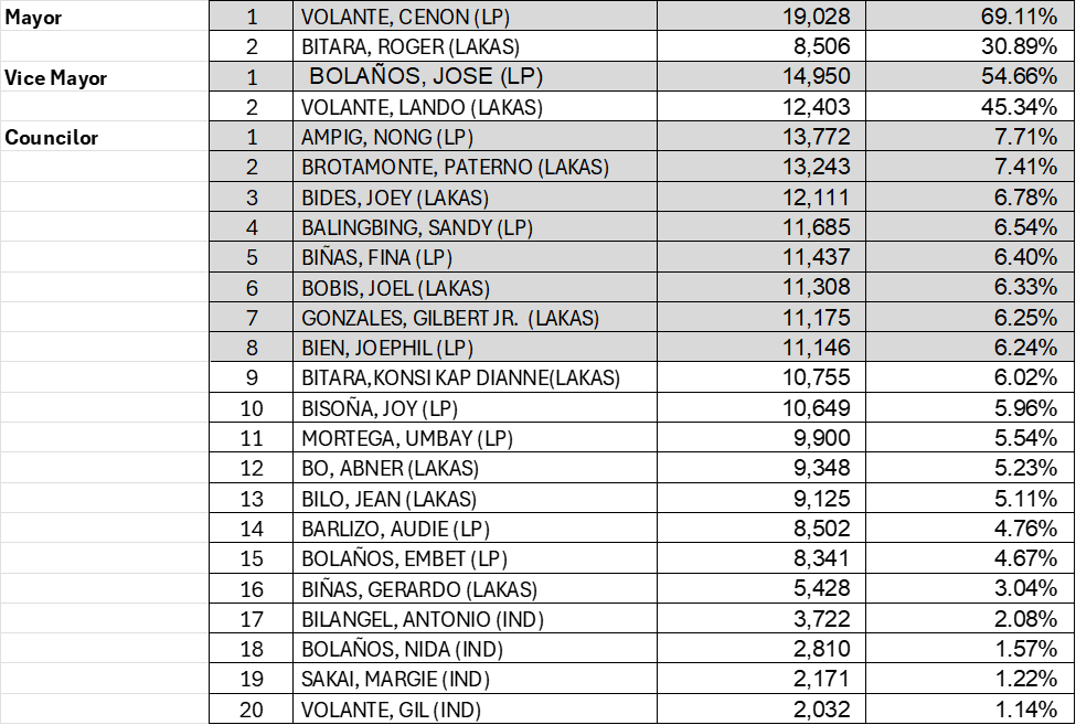 Vice Mayor Rolando Volante who is now with Lakas-Christian Muslim Democrats (LAKAS), however, did not get another term as he was beaten by Jose Bolanos, the running mate of Mayor Cenon. Bolanos got 54.66% of the votes cast as against Lando Volante’s 45.34%.